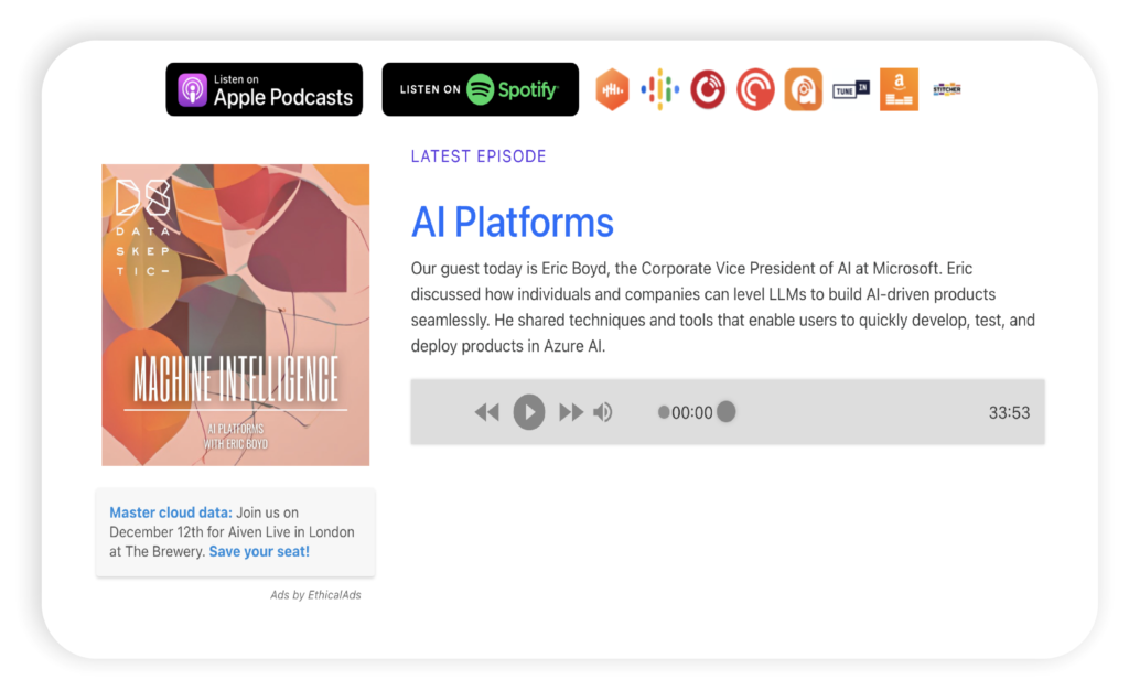 “Data Skeptic,” hosted by Kyle Polich, is a podcast that explores AI, machine learning, and data science through interviews with tech experts. Since its launch in 2014, the podcast has gained recognition as an authoritative source in the field. The episodes cover diverse topics, including fraudulent Amazon reviewers, the role of ML in cancer treatment, and discussions around the best machine learning algorithms.