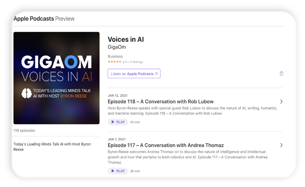 “Voices in AI” stands out by putting a human face on technology. Host Byron Reese interviews top minds in AI and tech, providing listeners with engaging conversations covering a wide range of topics. From startup co-founders to security experts and ethicists, each episode offers a unique perspective on trending issues in today’s tech world, providing a more human and relatable angle to AI discussions.